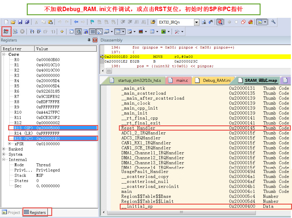 另外,我在野火 STM32 文档中也找到了印证,参考 在SRAM中调试代码 一文。 在此文中,单片机复位后 PC 和 SP 指针初始值异常(如下图),恰好印证了上述的启动流程。
